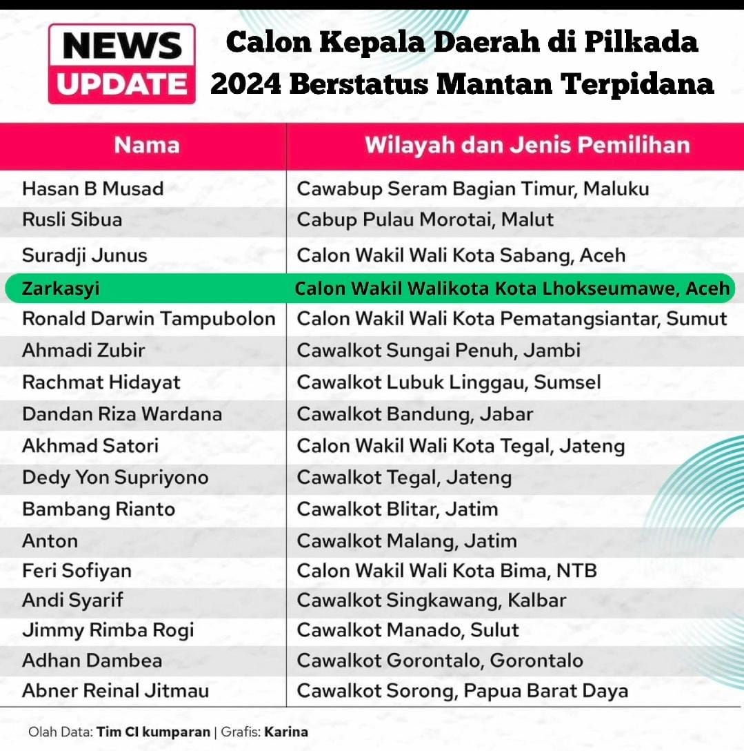Dari data tersebut kami menyisir beberapa variabel, salah satunya adalah riwayat hukum para kontestan. Berdasarkan data tersebut terdapat 64 calon pemimpin daerah yang merupakan mantan terpidana Salah satunya H Zarkasyi maju sebagai calon wakil walikota mendampingi H Fathani.