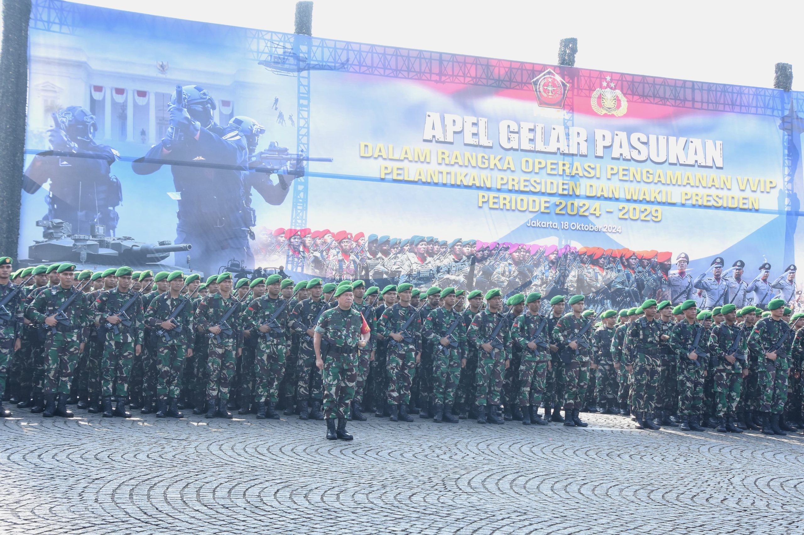 Apel Gelar Pasukan tersebut melibatkan 24.200 Personel TNI-Polri berikut Alutsista yang tergabung dalam Komando Gabungan Terpadu Pengamanan (Kogabpadpam) dibawah pimpinan Pangkogabwilhan l Laksamana Madya TNI Rachmad Jayadi, sebagai satuan tugas pengamanan, yang akan bertugas mulai tanggal 18 s.d 23 Oktober 2024, untuk mengamankan jalannya pelantikan dan pengambilan sumpah Presiden/Wakil Presiden pada tanggal 20 Oktober 2024 mendatang di Gedung DPR/MPR RI Senayan Jakarta Pusat.