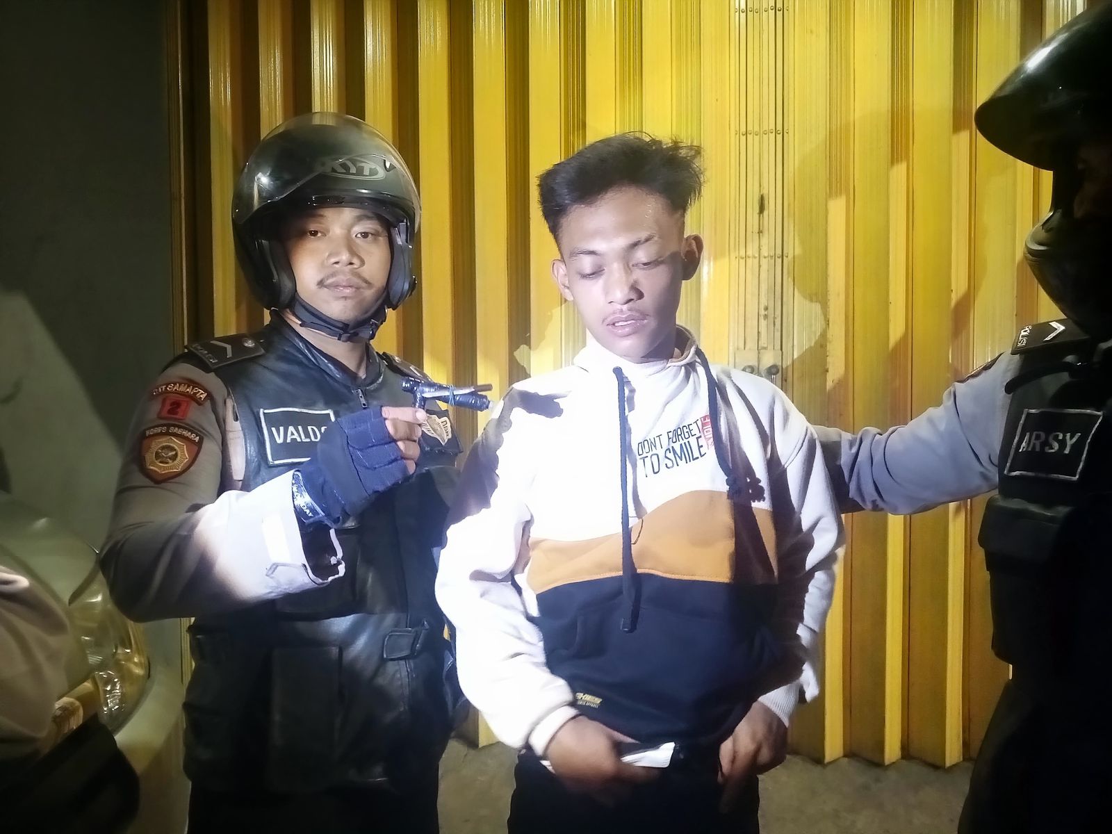Polisi Patroli presisi Polres Metro Tangerang Kota yang tergabung dalam Tim 1 saat melintas di lokasi, mencurigai dua pemuda yang berboncengan motor melintas sekira pukul 01.00 WIB.