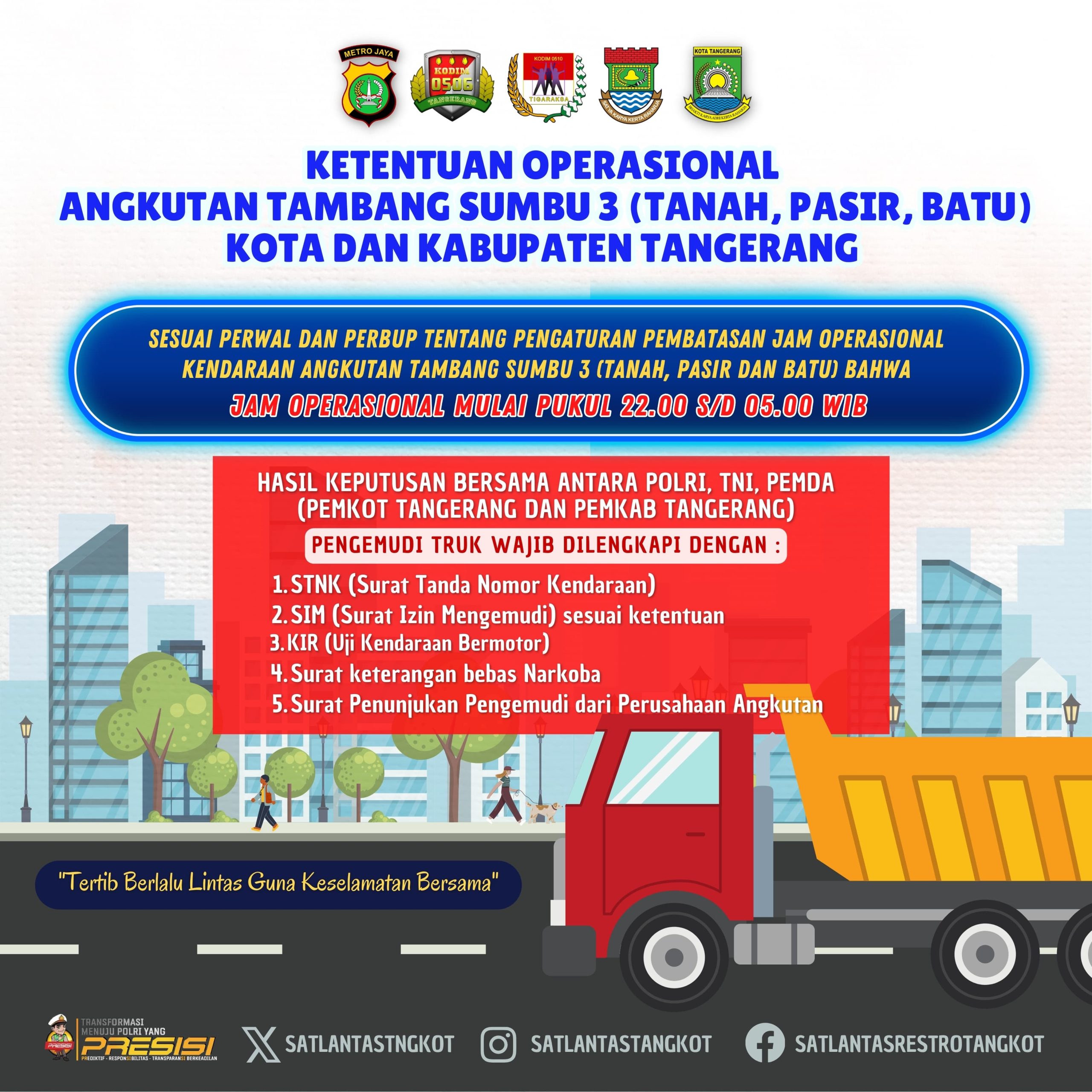 Kapolres Metro Tangerang Kota, Kombes Pol Zain Dwi Nugroho mengungkapkan, ada 5 (lima) persyaratan wajib yang harus dibawa pada saat berkendara oleh pengemudi truk tambang ini. Hal tersebut disampaikan sesuai hasil evaluasi dan rapat koordinasi digelar di Pendopo Bupati Tangerang, kawasan Pasar Lama, kelurahan Sukaasih, Kota Tangerang, kemarin.