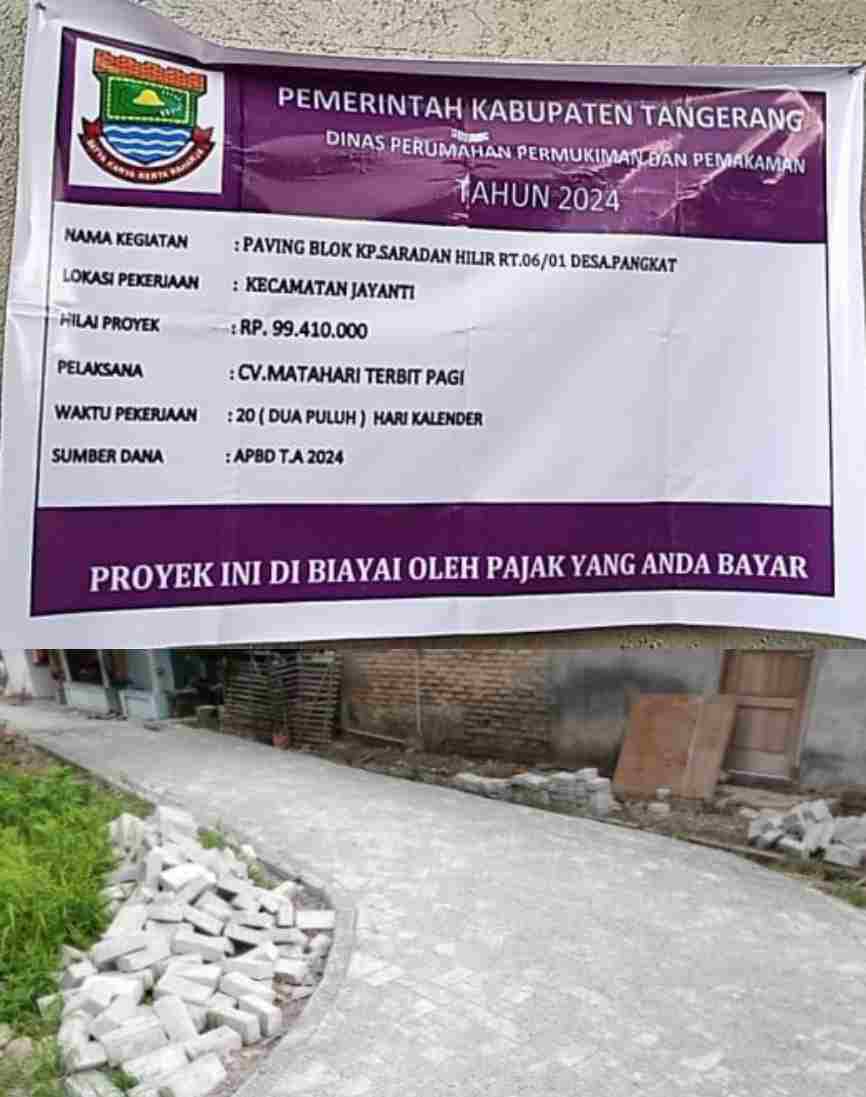 LINTASCAKRAWALANEWS.COM, || TANGERANG – Proyek Pembangunan Paving Block tepatnya di Kampung Saradan Hilir Rt 06/01 Desa Pangkat, Kecamatan Jayanti, Kabupaten Tangerang Diduga Mangkrak dan dikerjakan asal asalan sehingga dikeluhkan warga, diketahui proyek tersebut bersumber dari anggaran APBD Tahun 2024, Nilai Proyek Rp. 99.410.000 Pelaksana CV. Matahari Terbit Pagi, Pemerintah Kabupaten Tangerang Dinas Perumahan, Pemukiman dan Pemakaman, Sabtu, (23/11/2024)