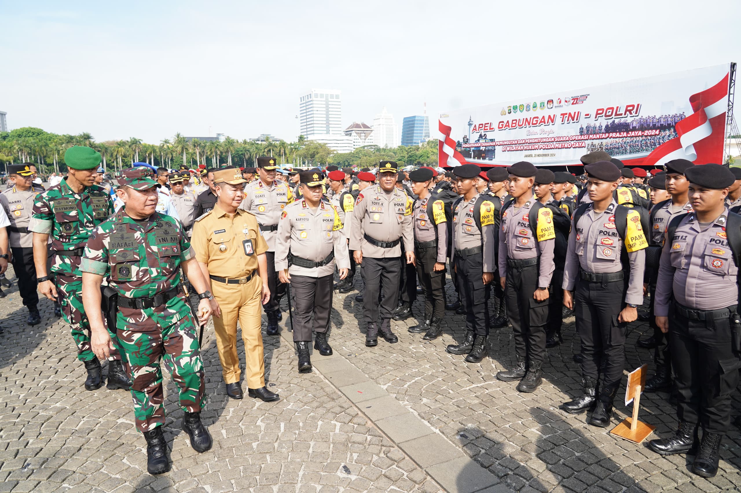 LINTASCAKRAWALANEWS.COM || JAKARTA PUSAT – Pangdam Jaya/Jayakarta Mayjen TNI Rafael Granada Baay, Kapolda Metro Jaya Irjen Pol Karyoto, S.I.K., dan PJ Gubernur DKI Jakarta Dr. Teguh Setyabudi, M.Pd., memimpin apel gabungan TNI-Polri dalam rangka pengamanan tahapan pemungutan dan penghitungan suara “Operasi Mantap Praja Jaya 2024 di Wilayah Hukum Polda Metro Jaya”, bertempat di Silang Monas, Cawan Selatan, Jakarta Pusat. Senin (25/11/2024).
