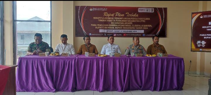 LINTASCAKRAWALANEWS.COM, || TANGERANG – Panitia Pemilihan Kecamatan (PPK) Jayanti, Kabupaten Tangerang Banten menggelar rapat Pleno terbuka rekapitulasi hasil perhitungan suara tingkat Kecamatan untuk Pemilihan Gubernur dan Wakil Gubernur Banten serta Pemilihan Bupati dan Wakil Bupati Tangerang pada Pilkada 2024, pada Jum’at, (29/11/2024)