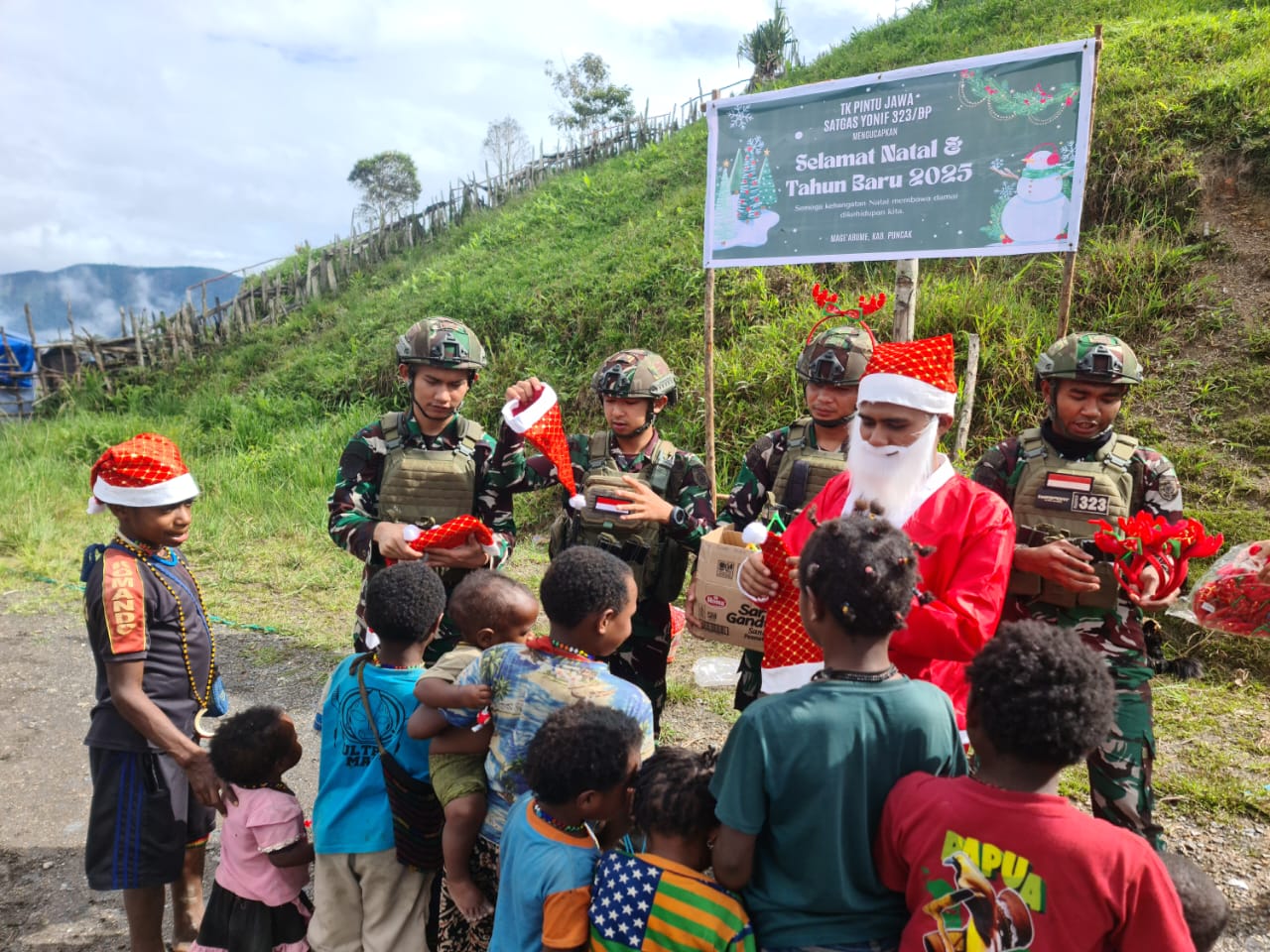 Dalam rangka menyambut hari raya Natal dan tahun baru 2025, prajurit Titik Kuat Pintu Jawa Satgas Pamtas Mobile RI-PNG Yonif 323/Buaya Putih melaksanakan kegiatan berbagi kepada masyarakat yang ada di sekitaran Titik Kuat Pintu Jawa. Adapun barang yang dibagikan yaitu topi santa, bando rusa, mainan anak-anak, dan kado natal.