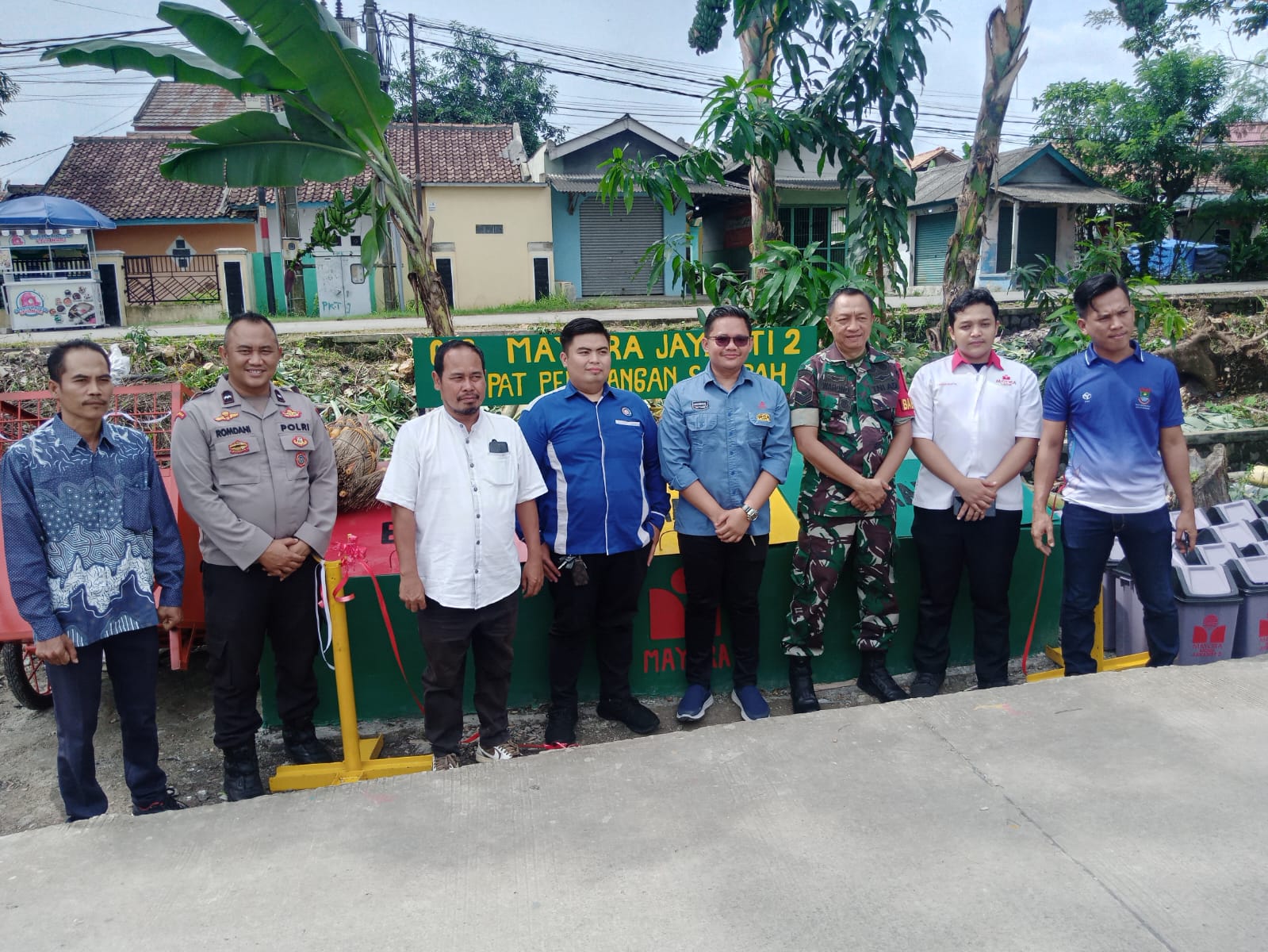 “Kita hari ini memberikan membuatkan, membangunkan tempat sampah yang permanen dan kemudian kita membagikan tempat sampah portable kemudian pengki, sapu dan ada gerobak juga”