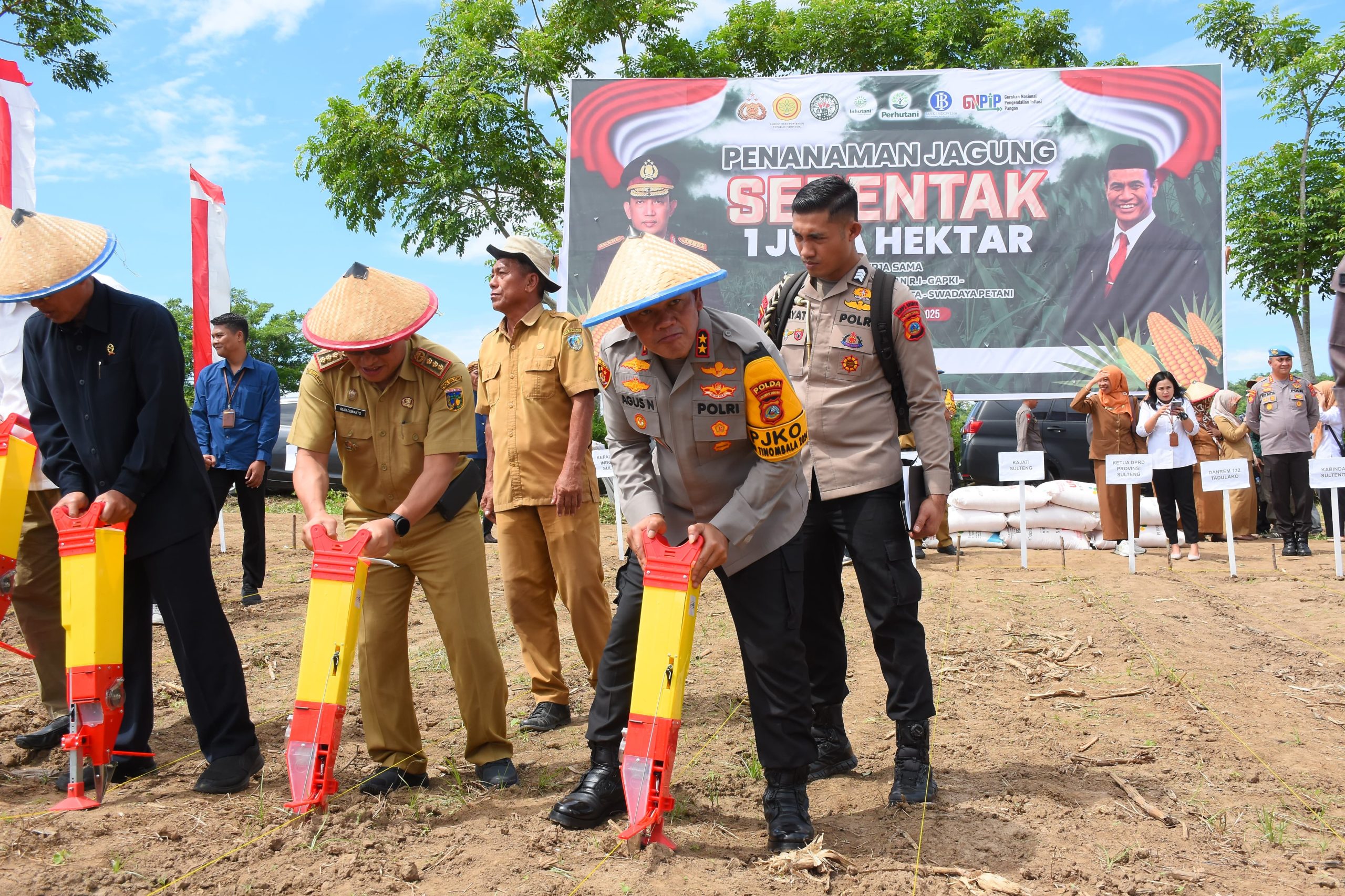 Kapolda Sulteng Irjen Pol. Dr. Agus Nugroho, S.I.K., S.H., M.H bersama unsur forkopimda Sulawesi Tengah, Kepala Dinas terkait, akademisi dan lapisan masyarakat berkesempatan menanam benih jagung di area seluas 30 hektar.