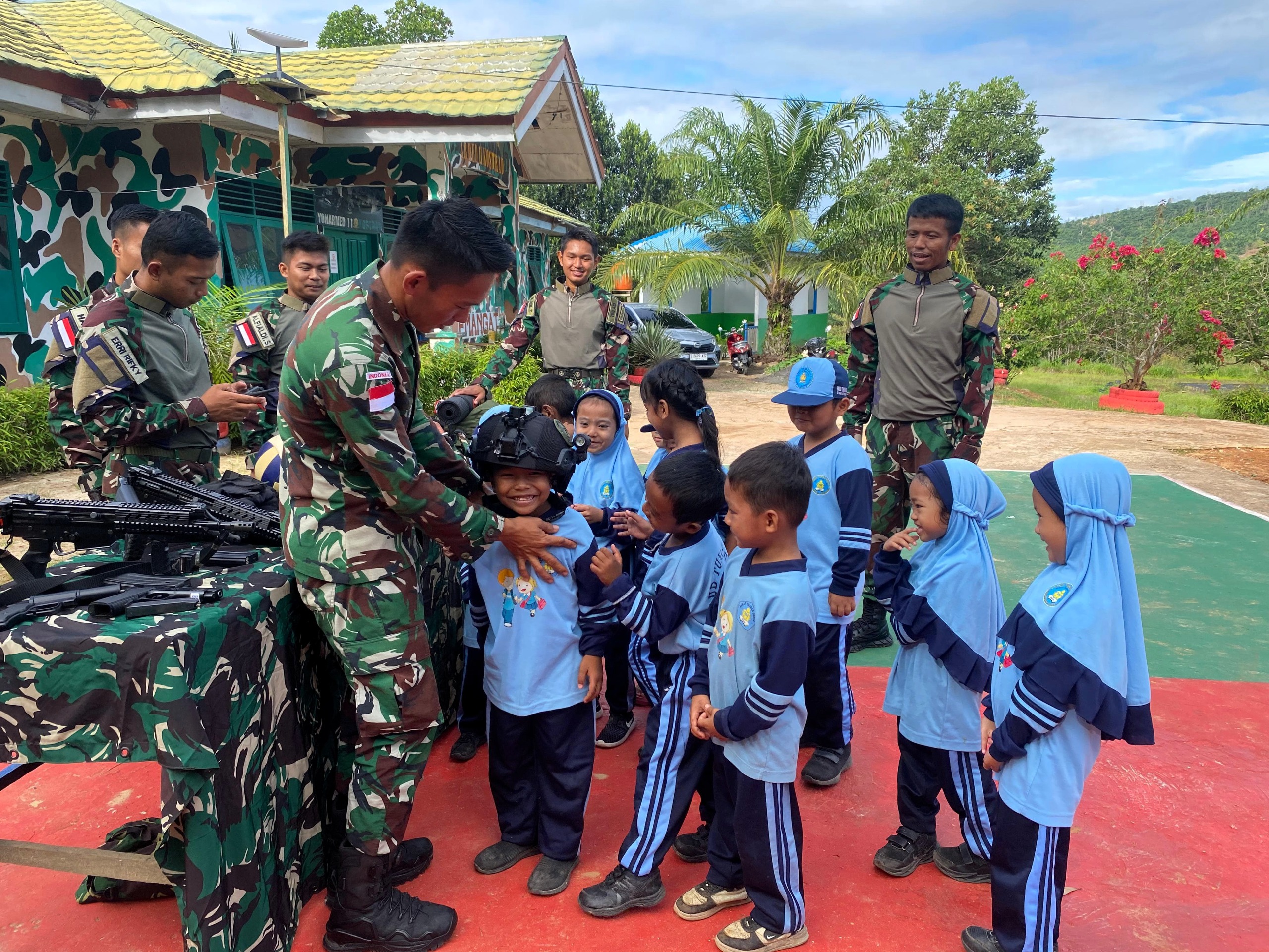 Dalam kunjungan yang penuh antusias ini, anak-anak diperkenalkan dengan berbagai perlengkapan militer, seperti seragam, senjata, dan peralatan lapangan yang digunakan oleh prajurit dalam menjalankan tugas menjaga perbatasan negara. Para prajurit dengan ramah memberikan penjelasan sederhana agar anak-anak dapat memahami fungsi dan peran TNI dalam menjaga kedaulatan negara.