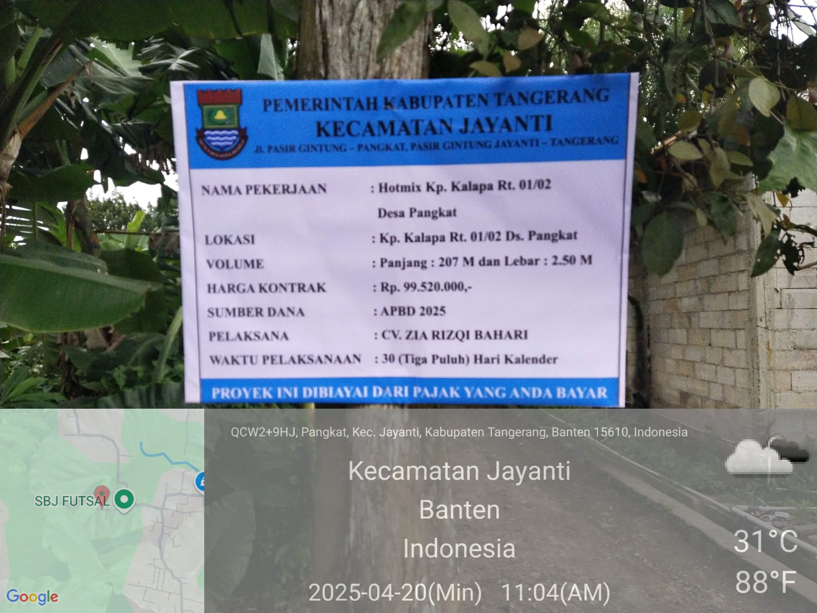 LINTASCAKRAWALANEWS.COM, || KABUPATEN TANGERANG – Pemerintah Kecamatan Jayanti mulai mengerjakan proyek pengaspalan (hotmix) jalan di Kampung Kalapa RT 01/02, Desa Pangkat. Proyek ini didanai dari APBD 2025 dengan nilai kontrak sebesar Rp99.520.000, dan dikerjakan oleh CV. ZIA RIZQI BAHARI dalam waktu 30 hari kalender. (Minggu 20 April 2025)