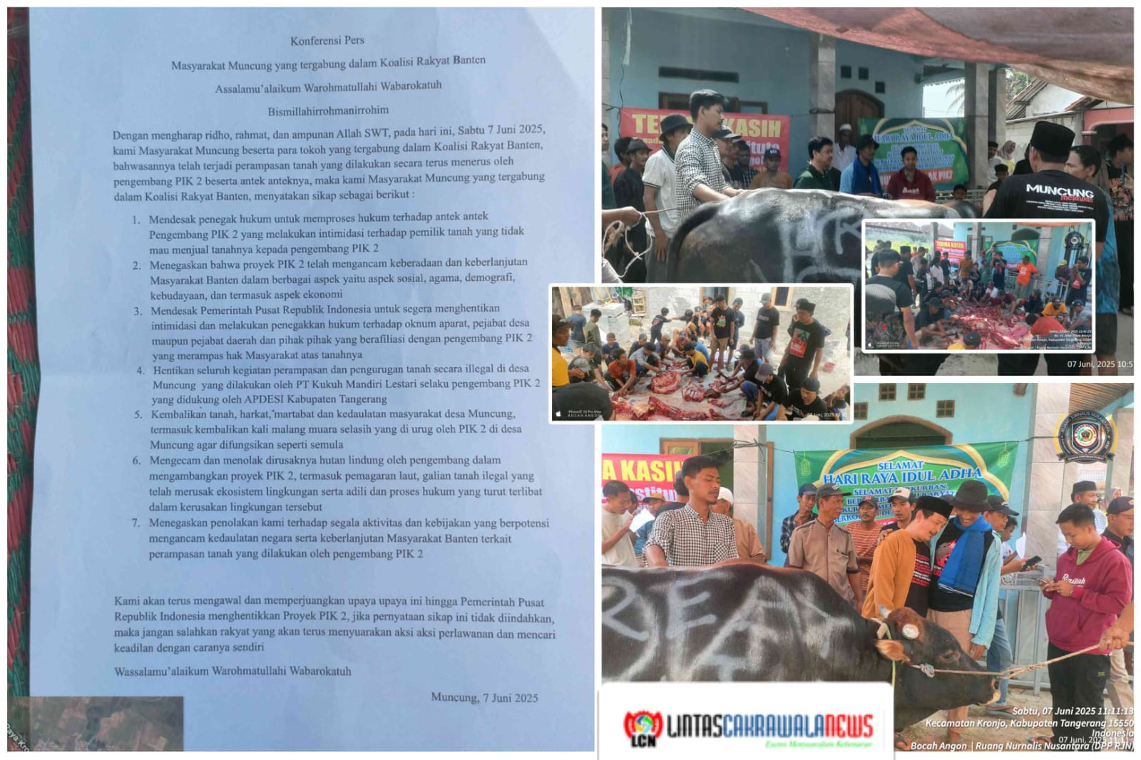 LINTASCAKRAWALANEWS.COM, Tangerang – Masyarakat Desa Muncung, Kecamatan Kronjo, Kabupaten Tangerang, yang tergabung dalam Koalisi Rakyat Banten, menggelar konferensi pers sebagai bentuk perlawanan terhadap praktik perampasan tanah dan kerusakan lingkungan yang dilakukan oleh pihak pengembang proyek PIK 2. Sabtu (7 Juni 2025)