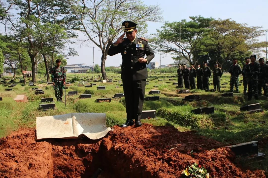 Acara kemudian dilanjutkan dengan upacara pemakaman secara militer di TPU Tegal Alur, yang dipimpin langsung oleh Komandan Kodim 0503/JB Kolonel Kav Sigit Dharma Wiryawan, S.H. Upacara pemakaman berlangsung khidmat dan tertib dengan susunan acara resmi militer, mulai dari penyerahan jenazah oleh pihak keluarga, pembacaan riwayat hidup singkat, Apel Persada, hingga penghormatan terakhir dan tabur bunga.