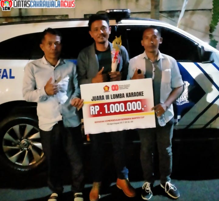 LINTASCAKRAWALANEWS.COM, SERANG — Pulang boyong piala dan uang pembinaan, Armand dari Kp. Kelompok Desa Kedung Kecamatan Gunung Kaler Kabupaten Tangerang, Sabet Juara 3 lomba karaoke dangdut tingkat Provinsi Banten. Senin, (18/8/2025).