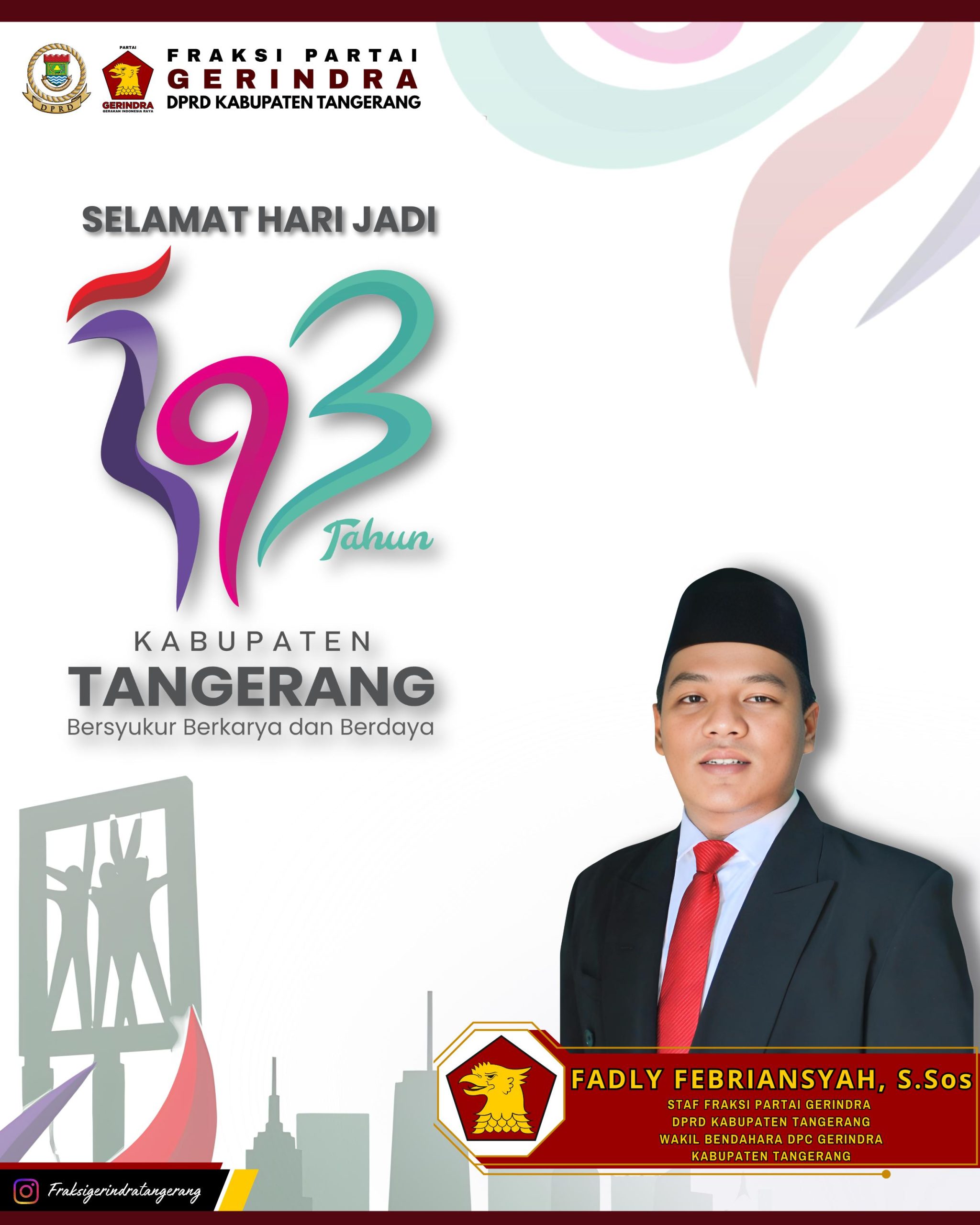 LINTASCAKRAWALANEWS.COM, | TANGERANG — Dalam rangka memperingati Hari Jadi ke-393 Kabupaten Tangerang, Fadly Febriansyah, S.Sos selaku Staf Fraksi Partai Gerindra DPRD Kabupaten Tangerang sekaligus Wakil Bendahara DPC Gerindra Kabupaten Tangerang, menyampaikan ucapan selamat dan doa terbaik bagi kemajuan Kabupaten Tangerang.