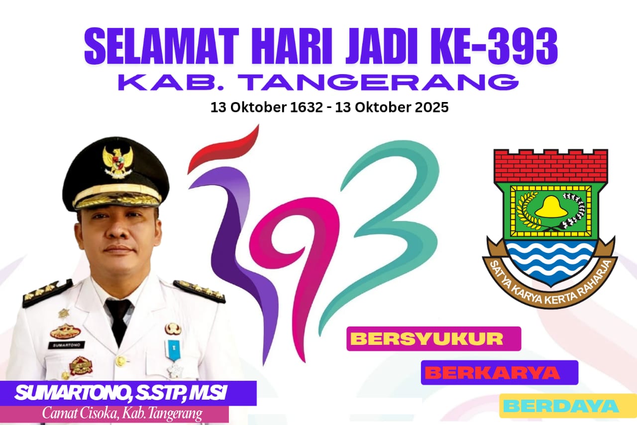 LINTASCAKRAWALANEWS.COM, TANGERANG – Camat Cisoka, Sumartono, S.STP, M.Si, menyampaikan ucapan selamat atas Hari Jadi ke-393 Kabupaten Tangerang yang diperingati pada tanggal 13 Oktober 2025.