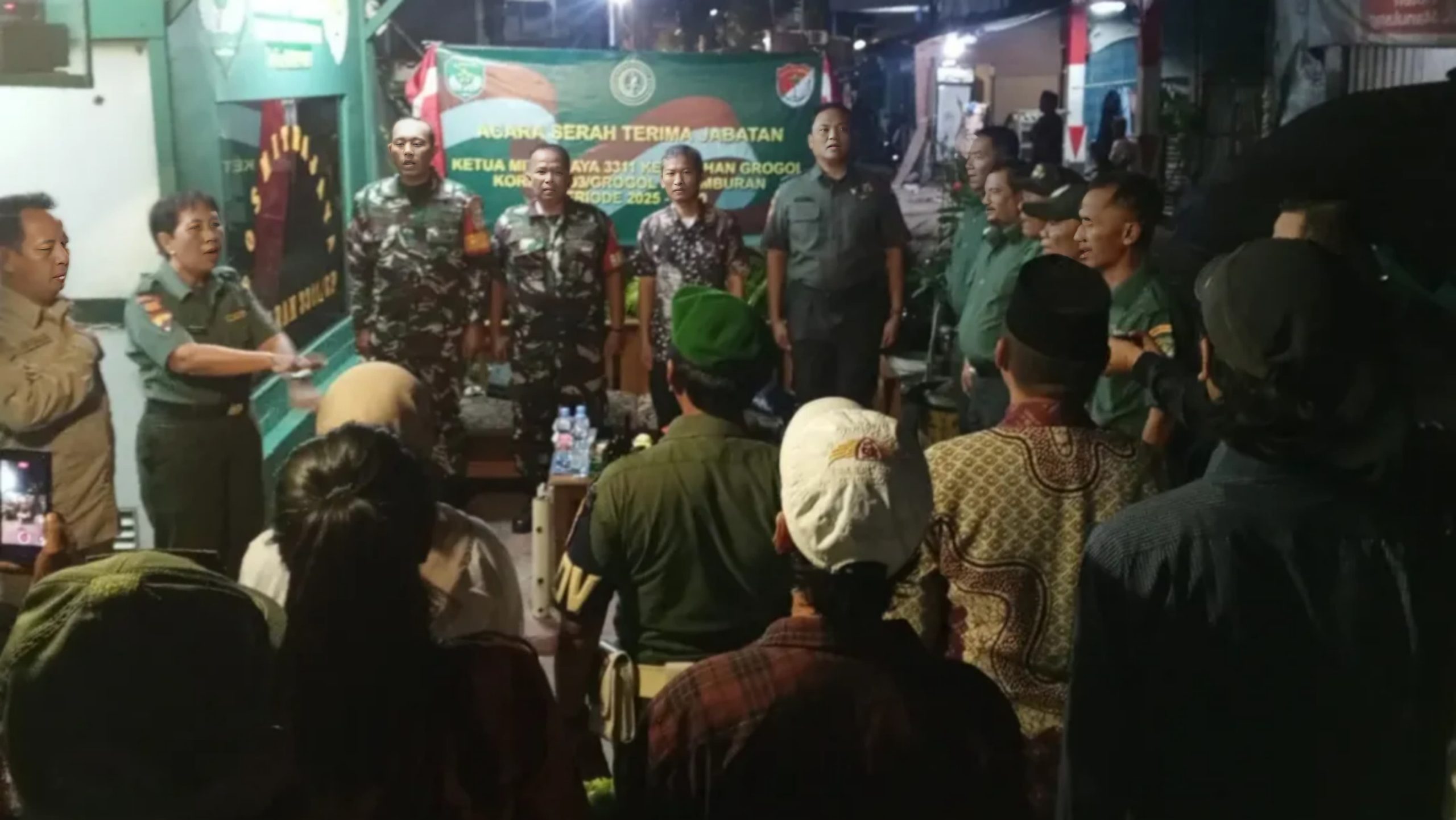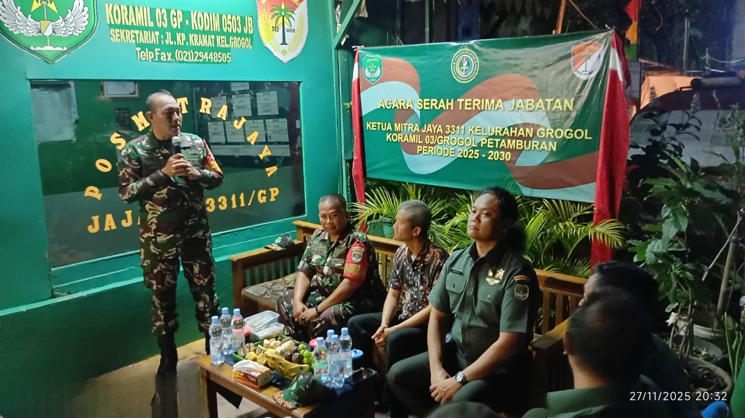 LINTASCAKRAWALANEWS.COM, | JAKARTA BARAT – Dalam rangka menjaga silaturahmi dan sinergitas, Dua personel Babinsa Kelurahan Grogol, Pelda Kiki Andi Winata dan Sertu Ade Syafrudin bersama Kasi Pemerintahan Kelurahan Grogol Bapak Abi Among Izza menghadiri kegiatan Serah Terima Jabatan (Sertijab) Ketua Mitra Jaya Jajaran 3311 Kelurahan Grogol Periode 2025 – 2030 dari Bapak Syaiful Bahri kepada Bapak Mamat, bertempat di Pos Mitra Jaya Jajaran 3311, Jl. Prof. Dr. Latumenten, Kampung Kramat RT.008/RW.09 Kelurahan Grogol, Kecamatan Grogol Petamburan, Jakarta Barat, Kamis malam (27/11/2025).