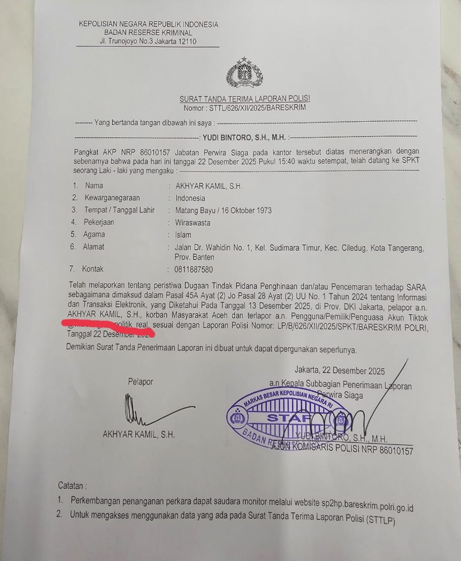 Dr.Emiral Rangga Tranggono,SH., M.H. Selaku Ketua Tim Advokasi Persaudaraan Aceh Seranto, hari ini kami membuat laporan ke Cyber Bareskrim melaporkan dugaan terhadap akun Tik tok Wdagelanpolitik, dengan laporan polisi nomer. L/B/626/XII/2025/SPKT/BARESKRIM POLRI Tanggal 22 Desember 2025.