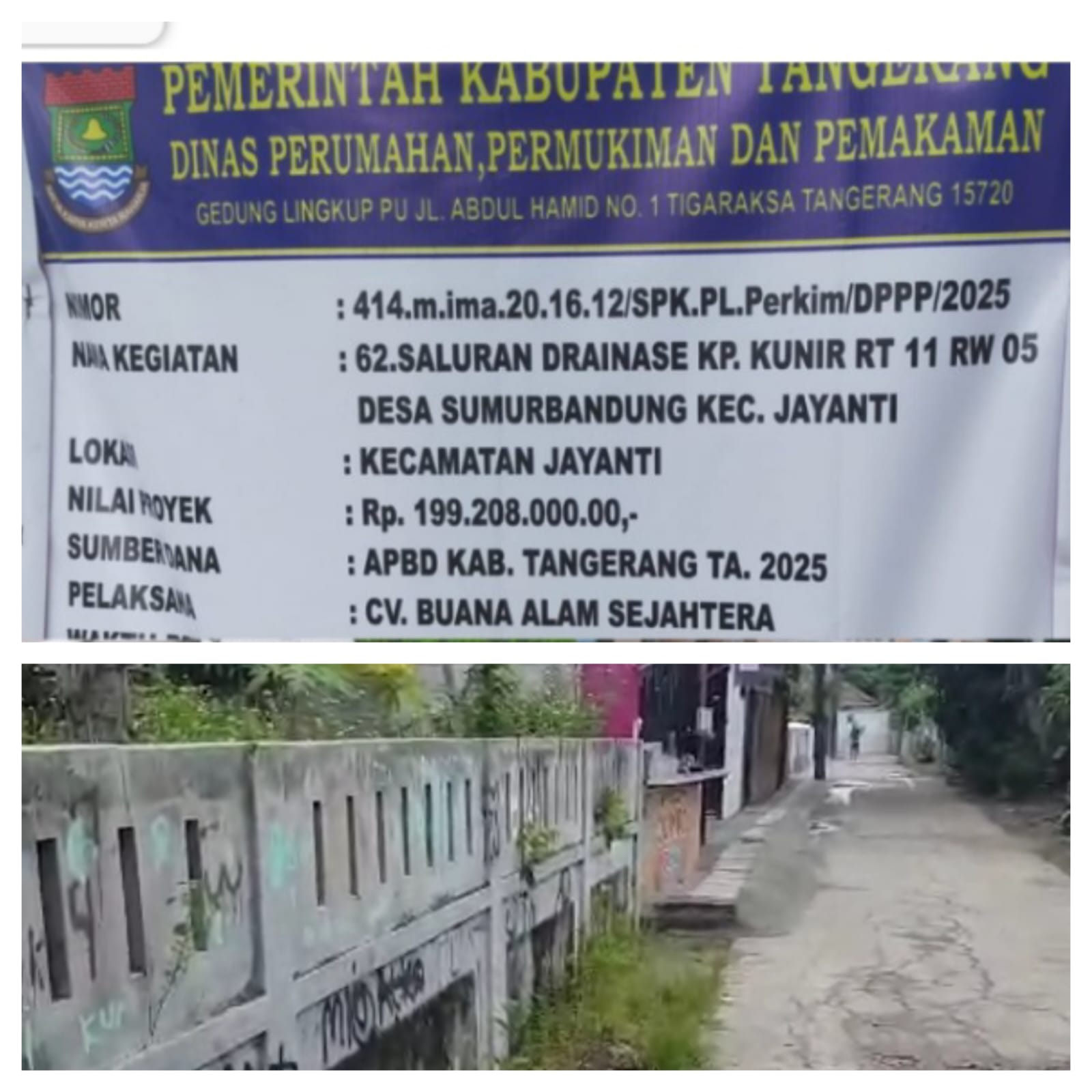 LINTASCAKRAWALANEWS.COM, | KABUPATEN TANGERANG — Proyek pembangunan drainase di Kampung Kunir RT 11 RW 05, Desa Sumur Bandung, Kecamatan Jayanti, Kabupaten Tangerang, diduga dikerjakan tidak sesuai spesifikasi teknis. Proyek yang dilaksanakan oleh CV. Buana Alam Sejahtera tersebut menelan anggaran sebesar Rp 199.208.000 yang bersumber dari APBD Kabupaten Tangerang melalui Dinas Perumahan dan Permukiman (PERKIM).