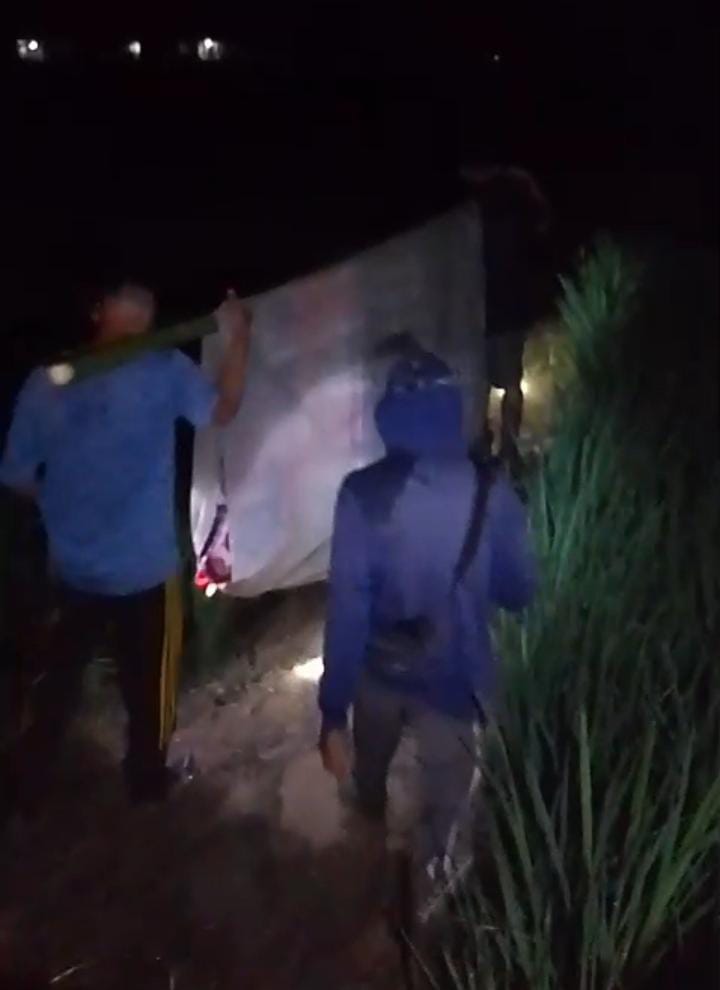 Dalam kondisi gelap gulita, warga hanya mengandalkan cahaya senter untuk menerangi jalan tanah yang licin dan becek. Mereka bergantian memanggul tandu darurat demi membawa pasien pulang ke rumahnya, karena kendaraan roda dua maupun mobil sama sekali tidak dapat melintasi jalan tersebut.