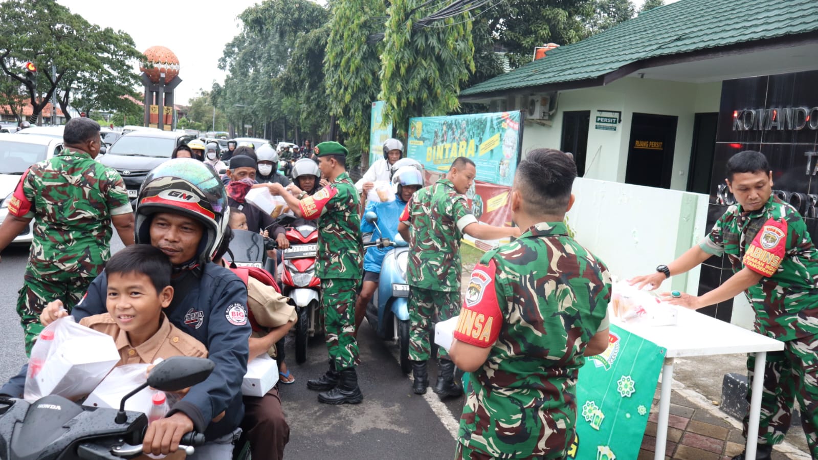 Dengan penuh semangat kebersamaan, anggota Koramil turun langsung membagikan ratusan paket takjil kepada pengendara roda dua (Ojol), roda empat, serta warga yang melintas menjelang waktu berbuka puasa.