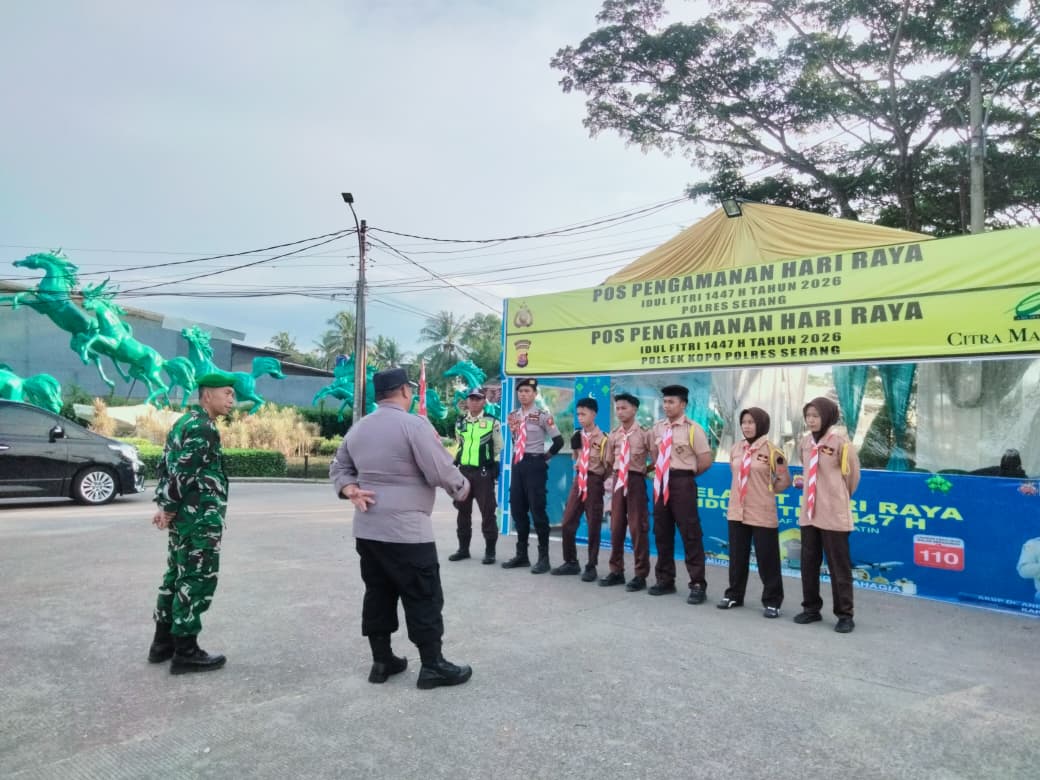 Serang. Lintascakrawalanews.com- Sebelum pelaksanaan pengamanan di pos pelayanan arus mudik libur panjang hari raya idul Fitri 1447 H. Polsek Kopo bersama Koramil 0602-21/Kopo Sat Pol PP Kecamatan Kopo dan Saka Bhayangkara laksanakan apel bersama di depan Gerbang Citra Maja City CMC Desa Mekar Baru Kecamatan Kopo Kabupaten Serang Banten Kamis 19 /03/2026.