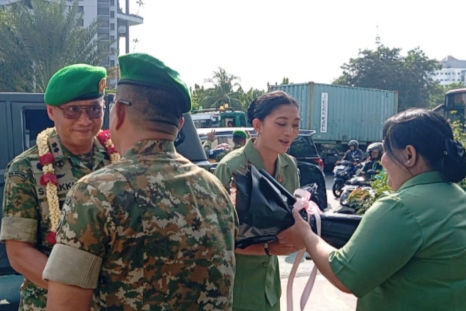 Rangkaian tradisi penyambutan dan penerimaan Dandim 0503/Jakarta Barat Letkol Inf Saputra Hakki, S.H., M.P.M., dan Ketua Persit Kartika Chandra Kirana Cabang XVII Kodim 0503 JB Ny. Novita Saputra Hakki disambut oleh Danramil 03/Grogol Petamburan Mayor Inf Manatap Rajagukguk, S.E., M.H., M.M., selaku WS.Kasdim 0503/JB beserta Ketua Persit KCK Ranting 4 Koramil 03/GP Ny. Yenny Manatap Rajagukguk, dengan pengalungan bunga sebagai simbol atau tanda ucapan selamat datang di Makodim 0503/Jakarta Barat, dilanjutkan hormat jajar oleh Prajurit Jaga Kesatrian.