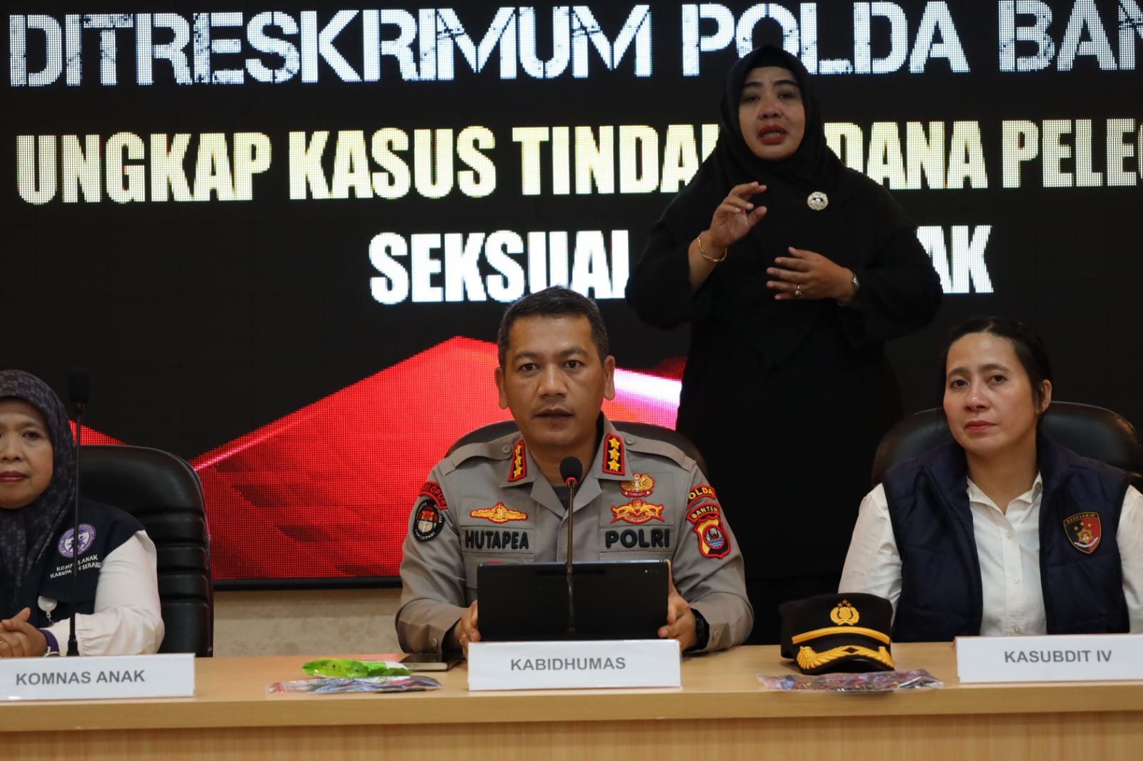 Dalam Press Conference yang di gelar Ruang Ditreskrimum Polda Banten pada Senin (20/04). Kegiatan dipimipin oleh Kabid Humas Polda Banten Kombes Pol Maruli Ahiles Hutapea didampingi Kasubdit IV Renakta Ditreskrimum Polda Banten AKBP Irene Missy dan dihadiri oleh perwakilan Komnas Perlindungan Anak Kabupaten Serang.